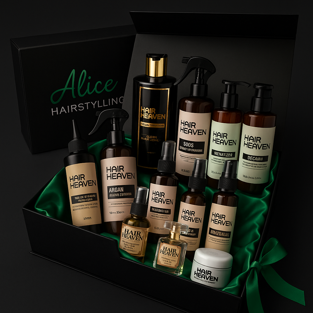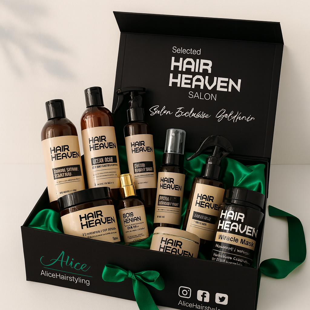 Elke box is verpakt in onze luxe satijnen geschenkdoos en gevuld met hoogwaardige Hair Heaven-producten, geïnspireerd op salonkwaliteit en verrijkt met kostbare arganolie voor zijdezacht, stralend haar. ✨