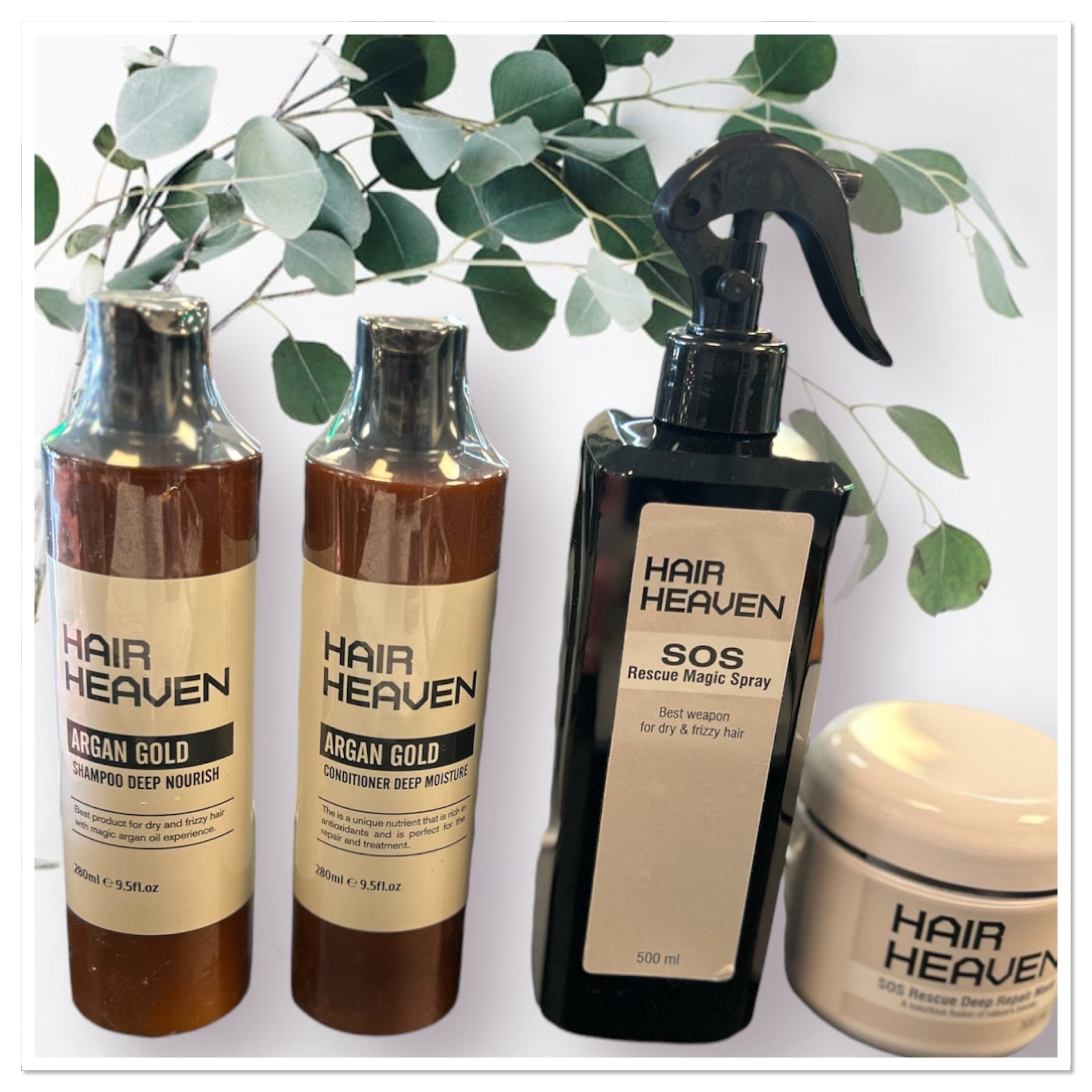 - SOS Hydration Rescue Box💫Argan Gold Shampoo&Conditioner,Hair Heaven Miracle Mask 1000ml,SOS Rescue Magic Spray,Hair Heaven Glaze,Hair Heaven Leave In Conditioner,Argan Oil, Heat Defender,Diamond Shine Spray